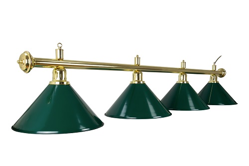 Questa lampada da biliardo di alta qualità con asta in ottone e paralumi verdi presenta un rivestimento interno bianco per una riflessione ottimale della luce.