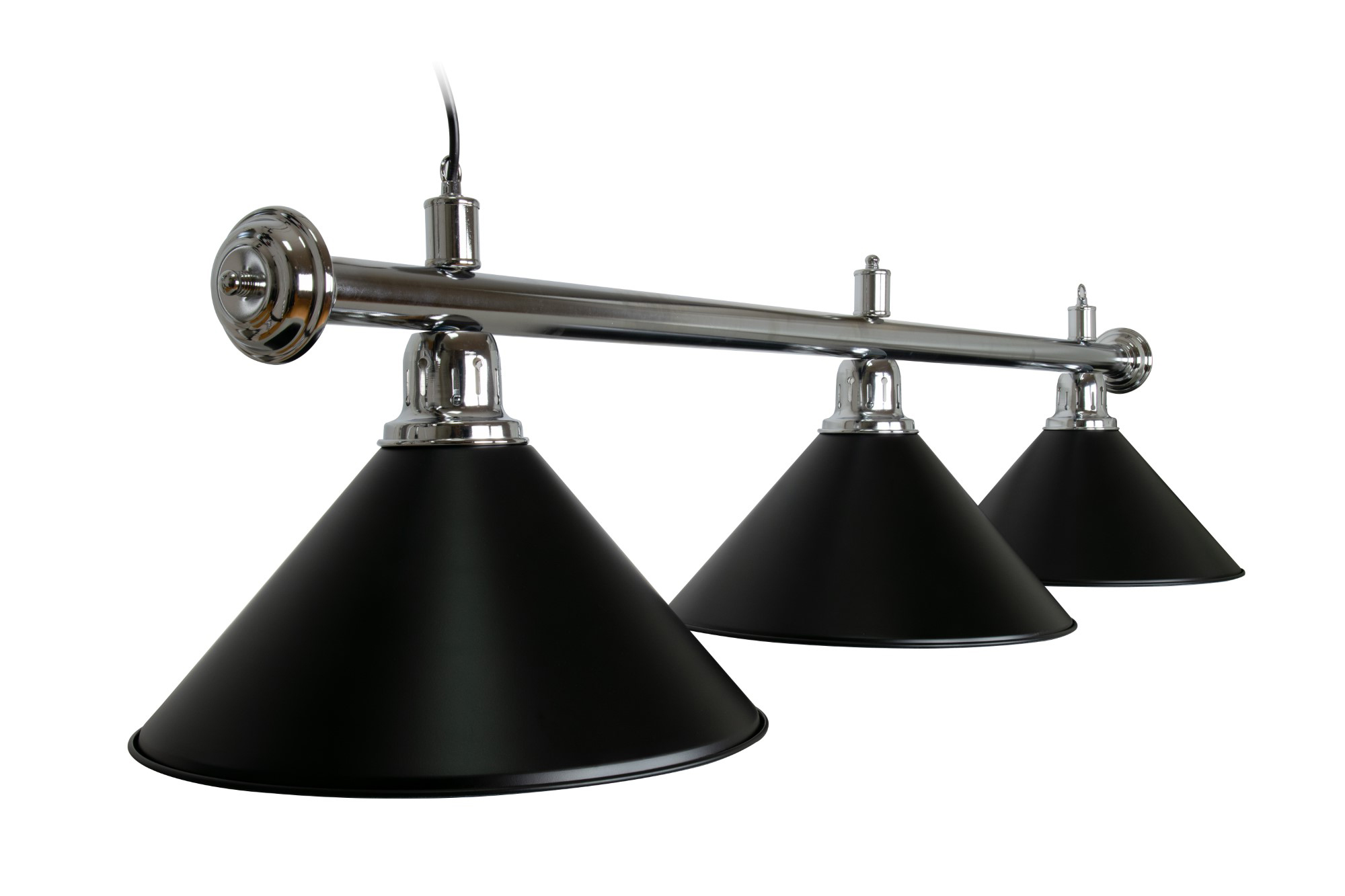 Questa lampada da biliardo di alta qualità con aste argentate e paralumi neri presenta un rivestimento interno bianco per una riflessione ottimale della luce.